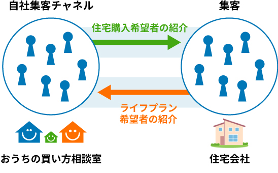 住宅展示場や完成見学会への行き帰りや、電話での来店問い合わせ。最近ではSNSからの問い合わせも増えています。住宅購入診断士がお客様の家創りに真摯にご対応、マイホームFPがライフプランニングで最適な住宅予算を算出。しっかりとした「購入動機と予算」が決まっているお客様を住宅会社様にご紹介する事で、住宅会社様は集客・成約コストが大幅に削減されますので、成約に至った際に住宅会社様から「紹介料」が支払われます。